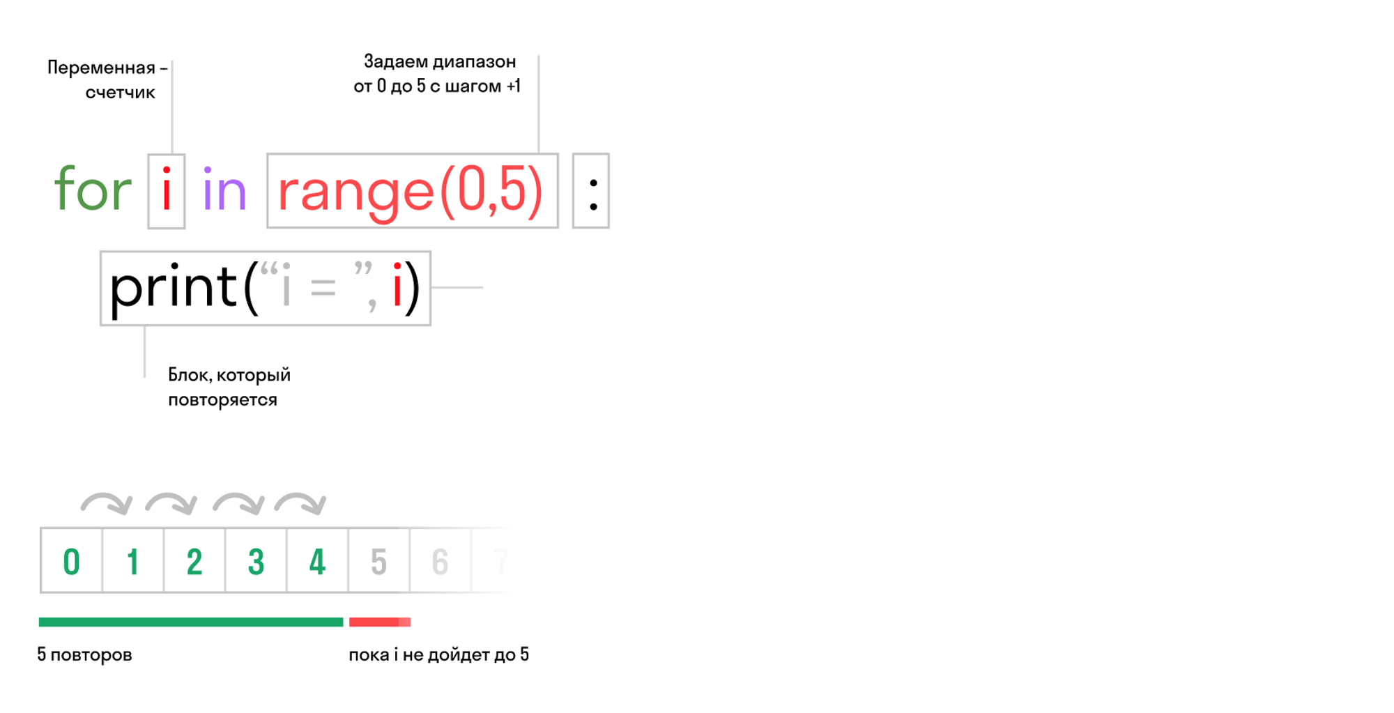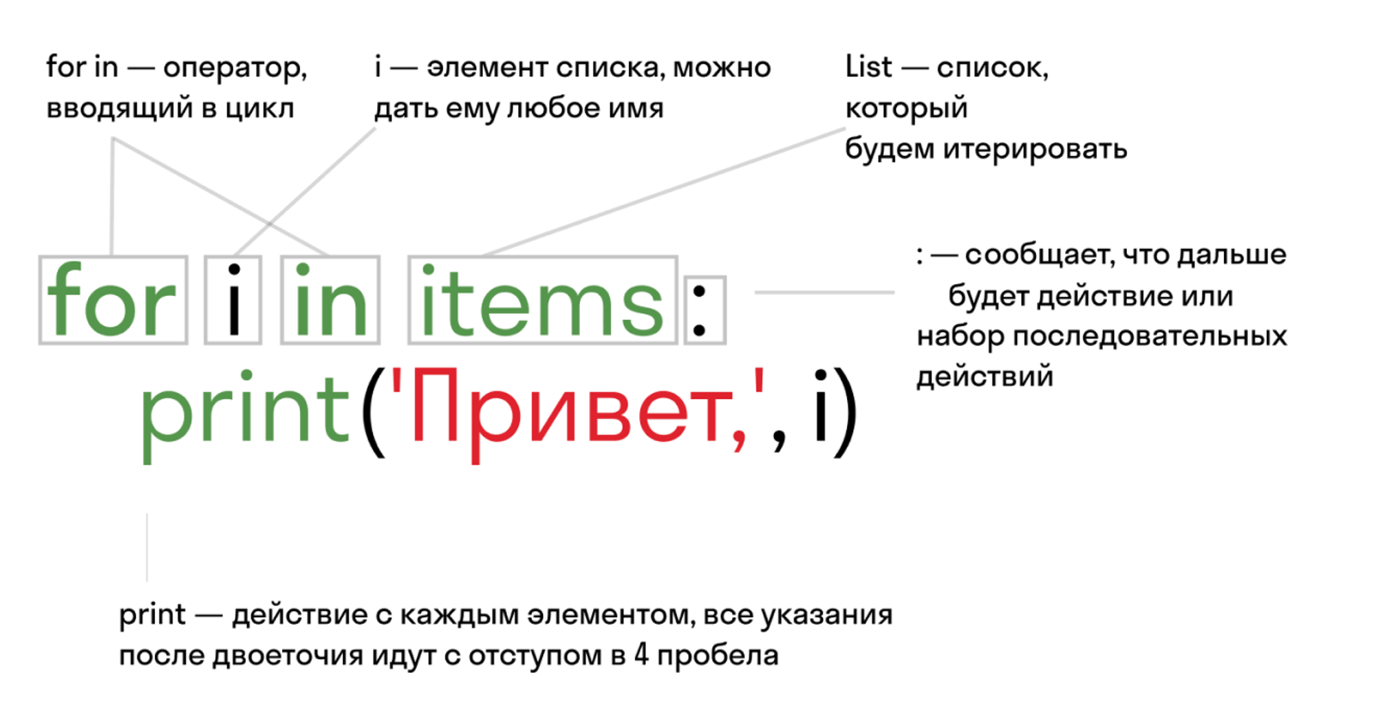 Блок — это код с отступом, который повторяется каждый раз.