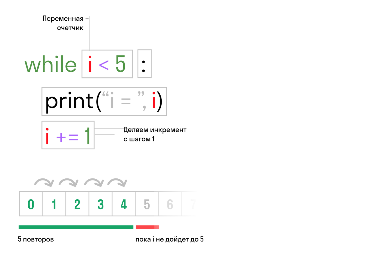 Цикл — это конструкция из оператора, условия и блока.