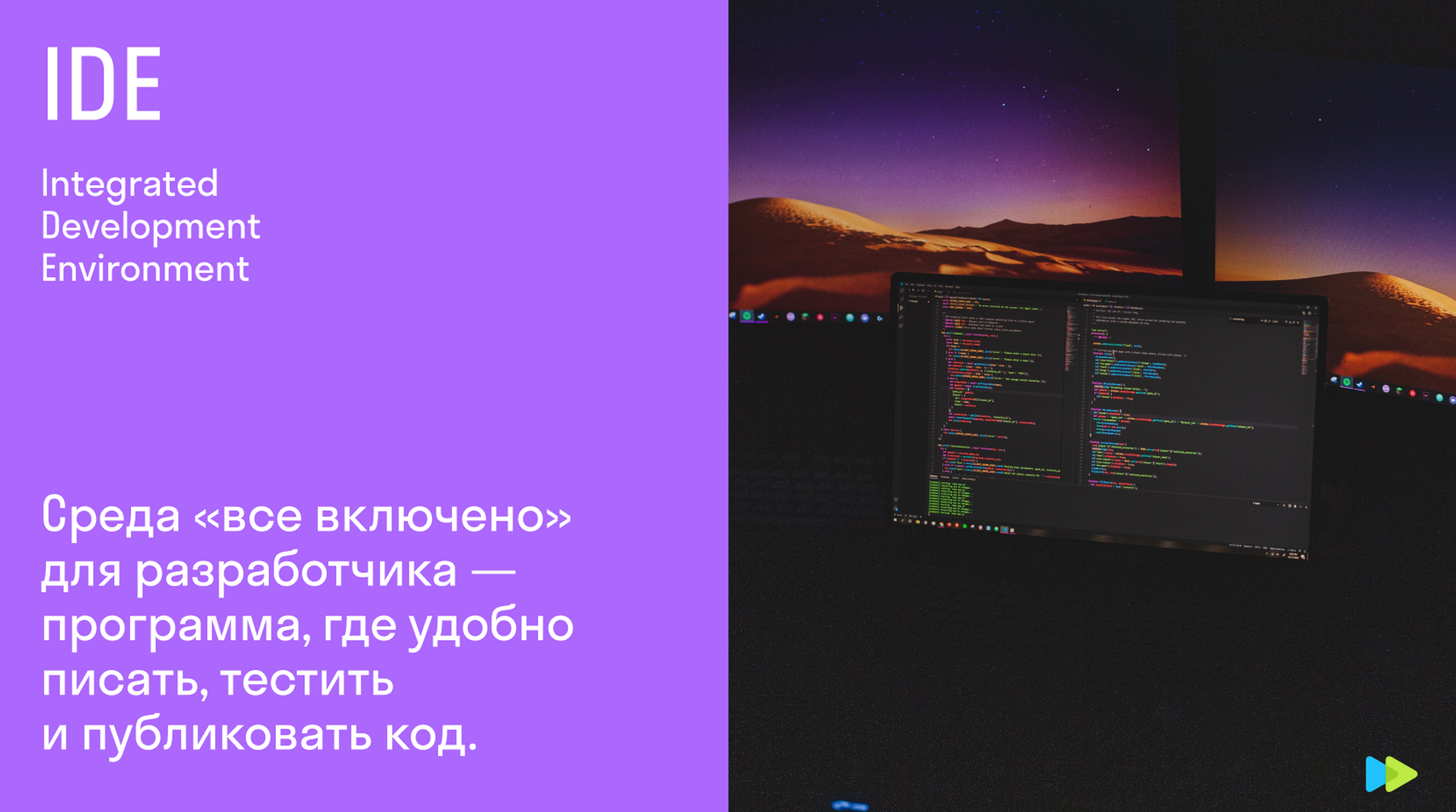 IDE — интегрированная среда разработки. Редактор с подсветкой кода, запуском, автодополнением, проверкой ошибок и еще сотней функций.