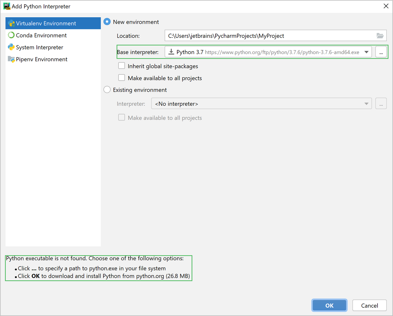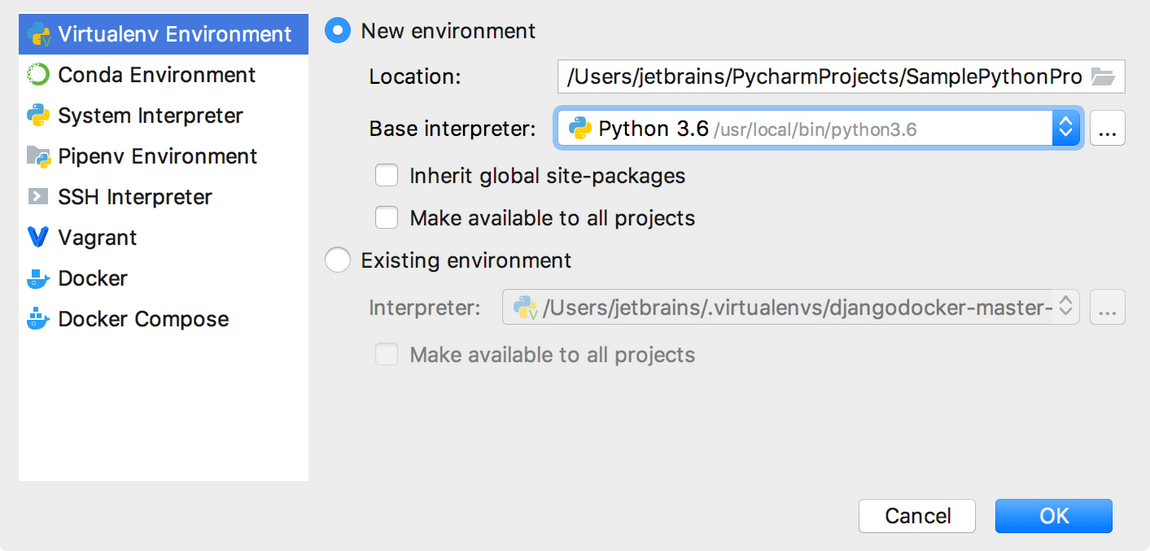 Поставьте вторую галочку Make available to all projects, если хотите, чтобы ваше новое виртуальное окружение можно было использовать в других проектах (рекомендуем не ставить).