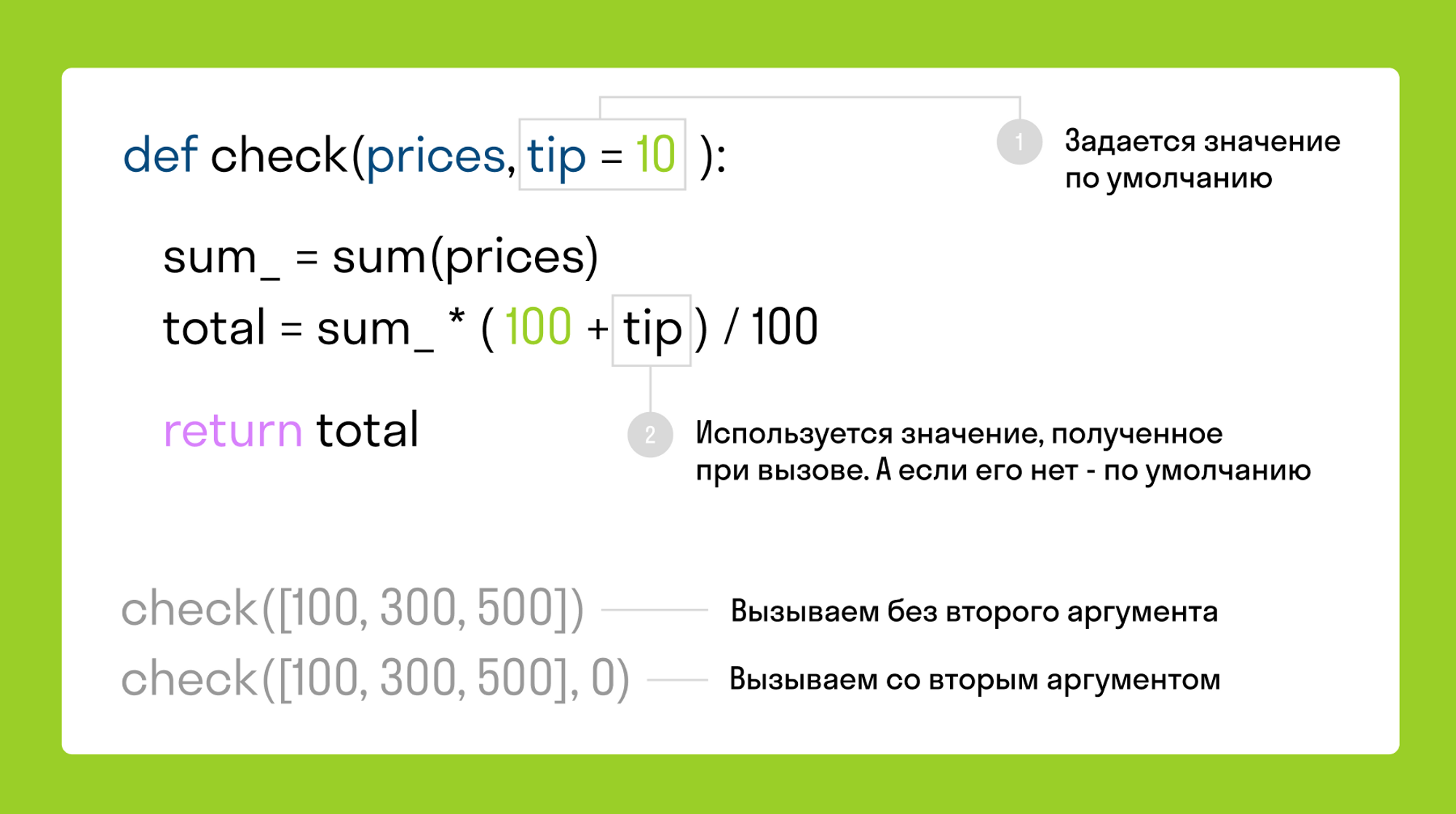Значение по умолчанию — указание дефолтного значения прямо в списке аргументов. Если у аргумента указано значение по умолчанию, он становится опциональным.