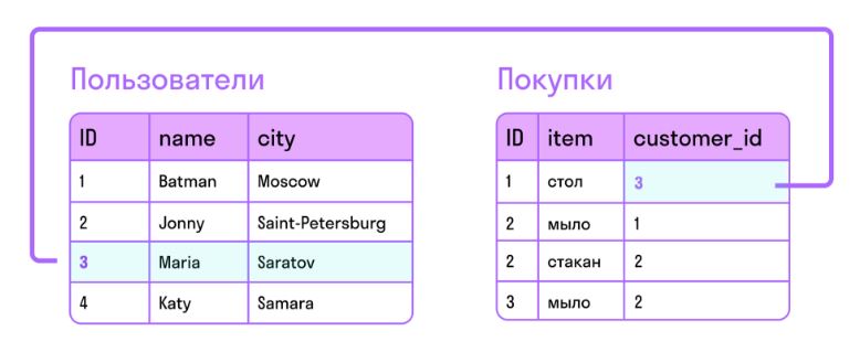 Существуют два вида БД: 1. **Реляционные** базы данных. В них данные хранятся в виде связанных таблиц. 2. **Нереляционные** базы данных. В них данные хранятся иначе. Например, в виде словаря или дерева. Данные в большинстве компаний хранятся в реляционных базах данных в виде связанных между собой таблиц. Обращаться к базе данных с помощью **SQL-запросов** нам позволяет **система управления базами данных — СУБД**.