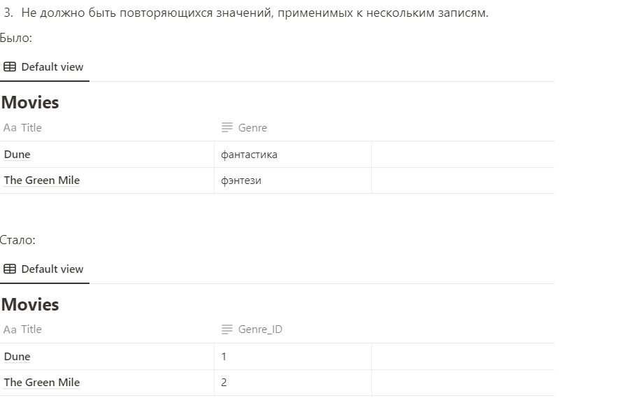 Нормальная форма — требования, которые должна выполнять БД, чтобы свести к минимуму ошибки в результатах выборки или изменения данных. 1. Не должно быть наборов значений в одной строке. Было: